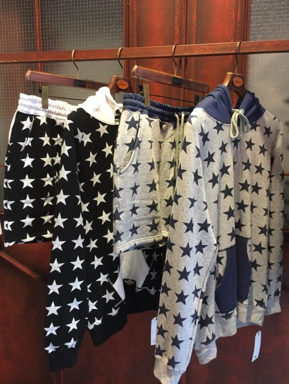 総柄のスターをプリントしたインパクトあるプルオーバーパーカーとショートパンツ。